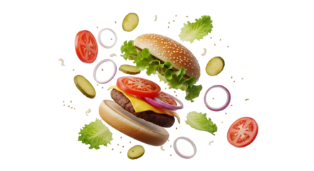 Deconstructed burger isolated on white background with ingredients floating around