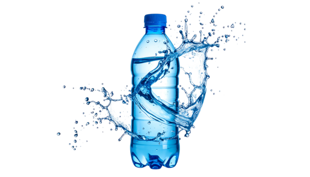 A clear plastic bottle filled with water is featured, with a brilliant splash effect cascading around it against a black background