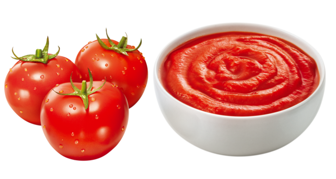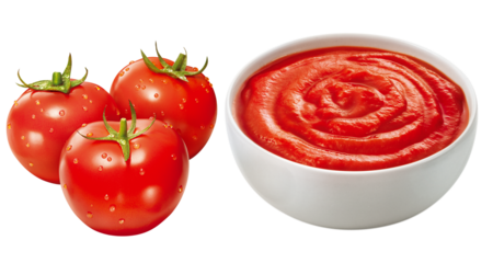tomates vermelhos suados e tigela com molho de tomate fresco isolados em fundo transparente - Molho de tomate ao sugo