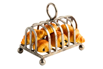 Fresh-baked golden croissants arranged in vintage metal rack isolated on transparent background