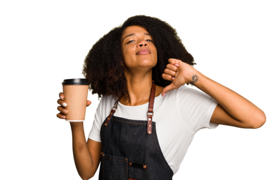 Young african american woman barista holding a takeaway coffee feels proud and self confident, example to follow.