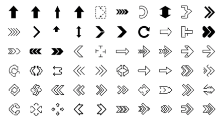 A diverse collection of black and white arrow icons and symbols for graphic design.