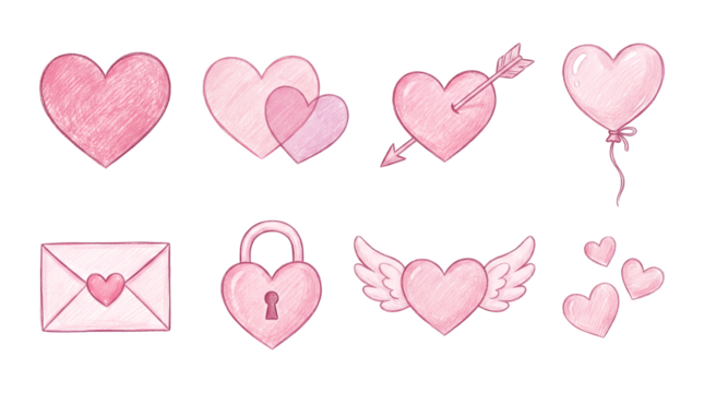 Pink heart collection including sketches of padlocks, wings, envelopes, arrows, and balloons. Romantic hand drawn doodles for valentines day and wedding decorations.