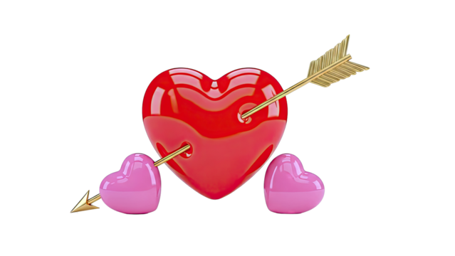 Pink heart pierced by golden arrow with heart shaped tip isolated on transparent background