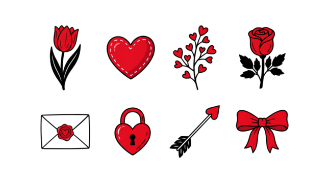 Valentine's Day romantic illustration set including heart, rose, tulip, lock, and arrow elements isolated. Hand drawn style love and wedding collection.