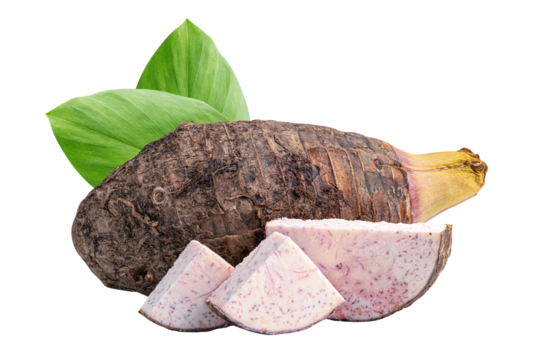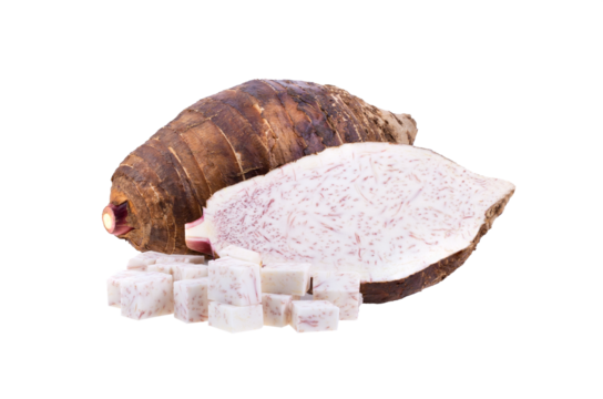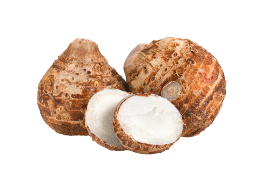 Set of 3 different vegetables isolated on white background with clipping path – fresh taro root, lotus root, and arrowroot, organic starchy vegetables for healthy diet, cooking ingredients, farm produ
