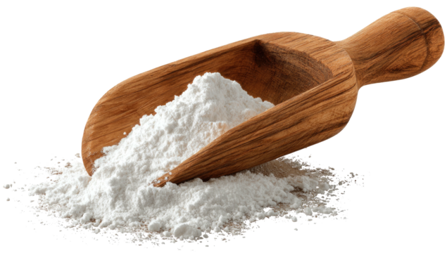 Wooden scoop with a pile of white powder spilling out