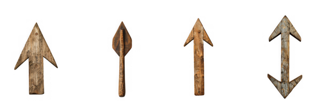 Weathered wooden signpost displaying empty directional arrows against transparent backdrop, representing navigational choices and travel uncertainty