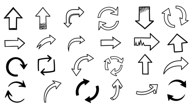 Hand-drawn PNG arrows set with transparent background, ideal for presentations, infographics, social media, graphic design, digital scrapbooking, educational materials, and creative projects