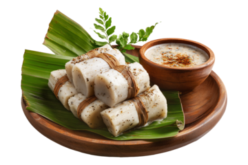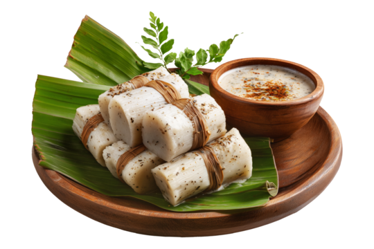 Taro portions wrapped and served with coconut sauce, placed on banana leaf over wooden plate isolated on white transparent background. Concept of Asian cuisine and food art. Micronesia grab-and-go mea