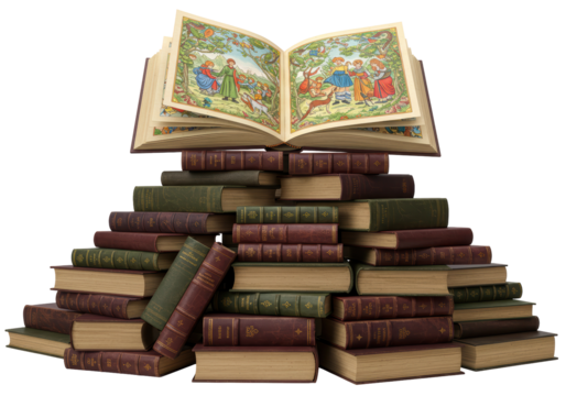 Isolated open illustrated book atop pile of antique hardcover volumes for literature fans