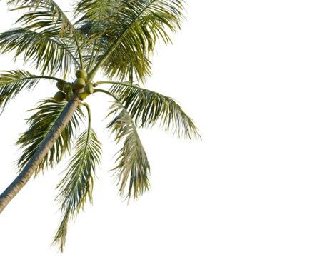 Cocos nucifera tree, corner view, cutout, transparent background, isolate, Detailed close-up of a lush green fern frond, showcasing intricate leaf textures and natural beauty.