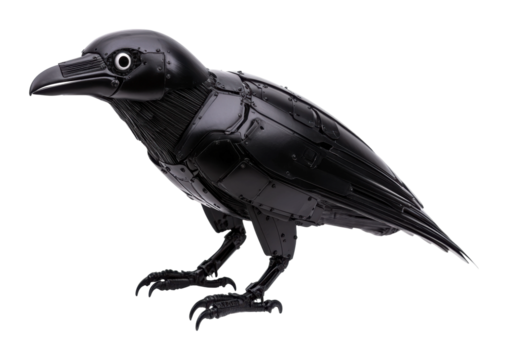 Futuristic mechanical raven sculpture art gallery 3d contemporary environment isolated on transparent background