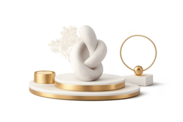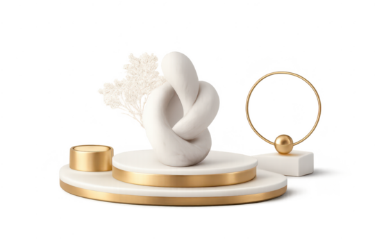 Intricate modern sculpture of flowing white ribbons and organic loops, creating a dynamic cloud-like form on a solid base against a clean white background