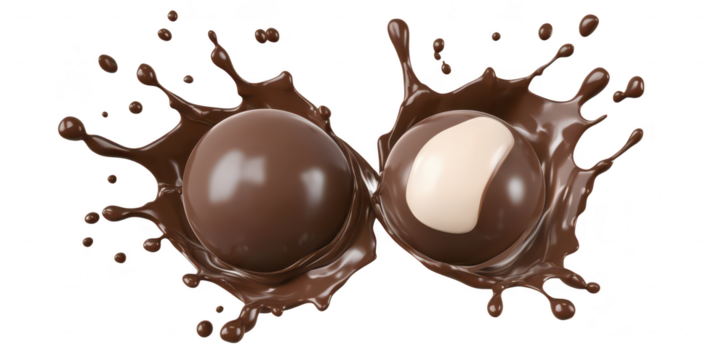 Two chocolate spheres splashing in rich liquid chocolate. a dynamic food scene with droplets flying around. perfect for culinary art or dessert advertisements