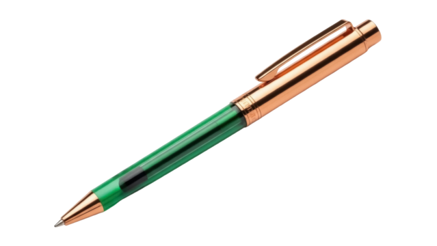 Isolated Pen, gold and green ballpoint for writing, drawing, signing documents at desk