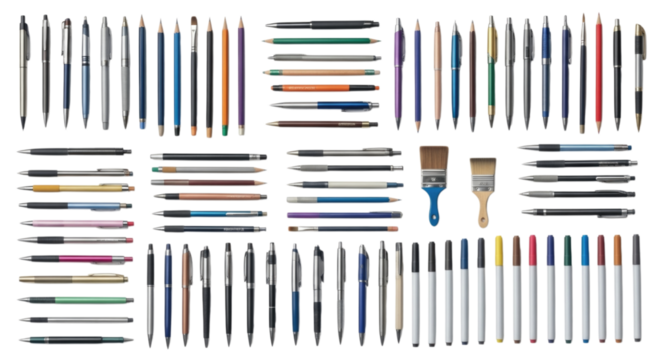 Paint-splattered brushes for creative artwork, cut out - stock png.