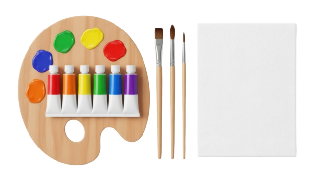 Isolated art supplies including wooden palette, paint tubes, brushes and blank canvas artboard
