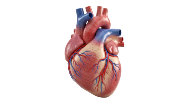 Human heart anatomical model with blood vessels, ventricle, atrium for medical study on transparent background