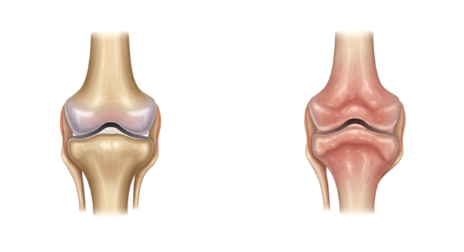 Healthy versus arthritic knee joint comparison; anatomical illustration showing cartilage deterioration.