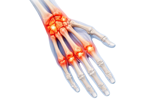Human hand wrist joint anatomy showing bone inflammation pain arthritis medical illustration isolated on white background