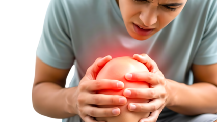 Man holding knee suffering from joint pain and inflammation medical health concept isolated on transparent background