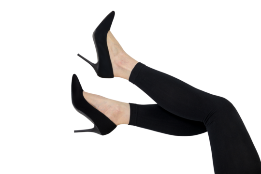 Women's legs in black high heels and leggings. Fatigue, arthritis and pain from wearing high heels. Fashionable style and elegant shoes for women audience.
