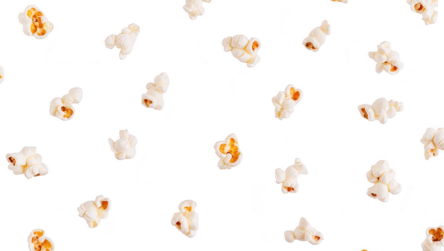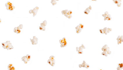 A flat lay of scattered popcorn kernels on a clean white background. their texture and color. ideal for food photography. snack-related content. or culinary articles