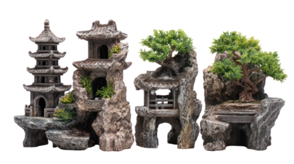 Artificial aquarium decorations featuring pagoda and rockery landscapes