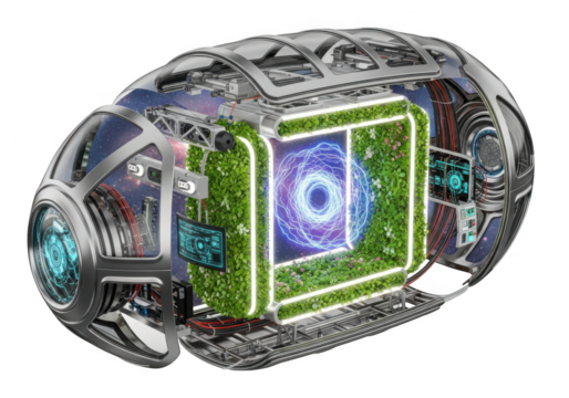 A white, robotic brain model, partially dissected to reveal glowing orange internal circuitry and a blue digital component
