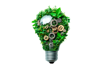 A light bulb made of green leaves and gears isolated on transparent background