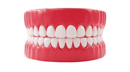 A set of dentures featuring white teeth and a pink gumline displayed against a black background