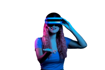 A woman experiencing virtual reality using a VR headset, she has her arms raised, interacting with the digital world, isolated on transparent background
