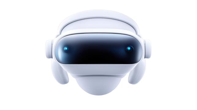 Smiling man wearing futuristic virtual reality headset on transparent background