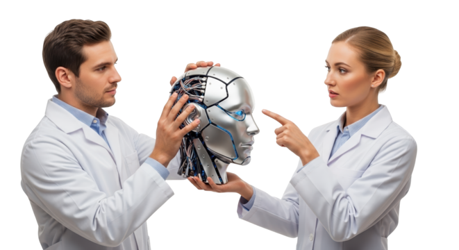 Two scientists analyzing robot head with artificial intelligence in a laboratory setting research study on transparent background