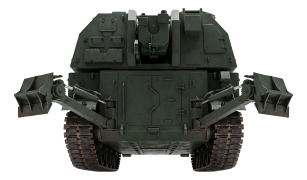 Self-propelled artillery unit featuring long tracks and rear stabilizing spades.