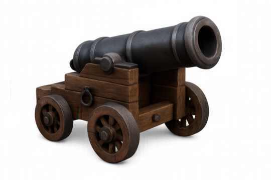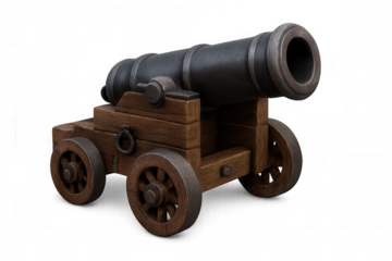 Powerful medieval artillery piece, an ancient cannon mounted on a sturdy wooden carriage, set against a transparent background