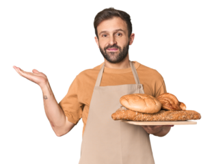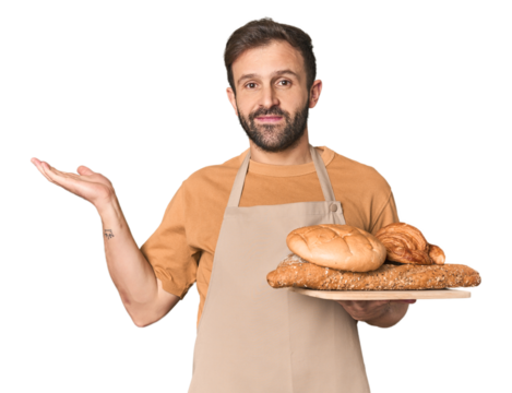 Hispanic male baker with bread tray showing a copy space on a palm and holding another hand on waist.
