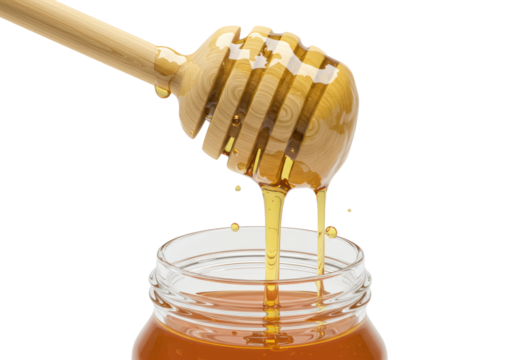 Close-up of a wooden honey dipper lifting and dripping a thick, golden stream of natural honey into a clear glass jar, isolated on a transparent background. Concept of natural sweetness and purity