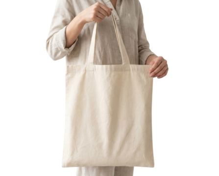 A person holds a large, plain fabric tote bag with two handles, showcasing its spacious design.