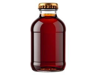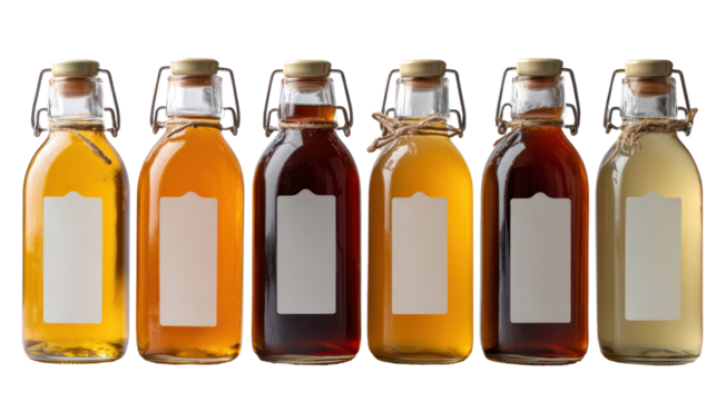 Homemade kombucha in small glass bottles with blank labels on transparent background