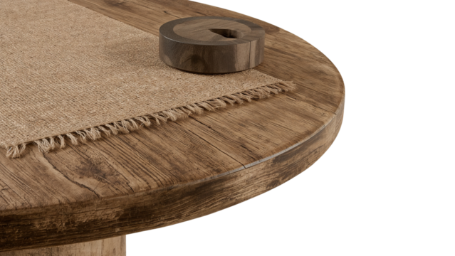 Rustic round wood table with burlap placemat and wooden coaster on transparent setting