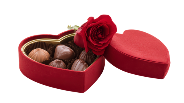 Elegant heart shaped red box filled with sweet chocolate candies and romantic red rose for valentine celebration sweet indulgence perfect gift