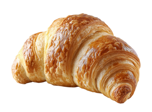 Golden flaky croissant with crisp layers, shiny buttery texture and artisanal craftsmanship, perfect French pastry for breakfast, snacks, or gourmet meals isolated on transparent background