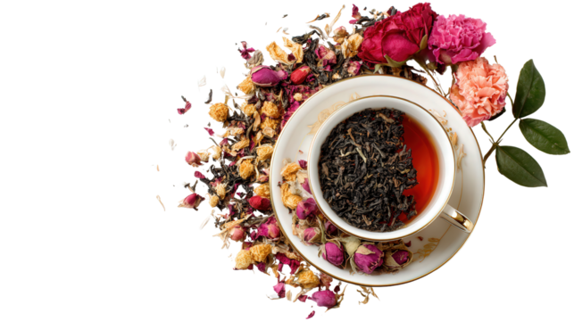 Artisanal Tea and Teacup Flat Lay: A flat lay of artisanal tea and a teacup, isolated on a Transparent background, PNG file.