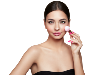 Portrait beautiful young woman with clean fresh skin. Model with cosmetic makeup brush. Healthy clean fresh skin natural make up beauty eyes
