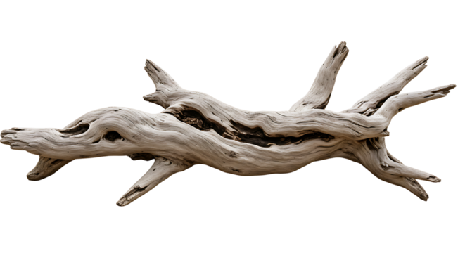 A weathered driftwood branch with intricate textures and shapes. isolated on a white background. ideal for nature-themed designs and organic decor inspiration