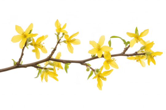 A delicate branch adorned with yellow flowers against a clean white background. the beauty of spring blossoms. perfect for nature-themed designs or floral arrangements