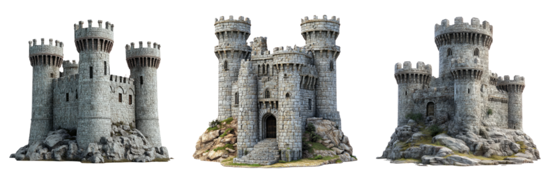 Medieval stone towers and castle turrets isolated on transparent PNG image perfect for fortress-building or strategy games
