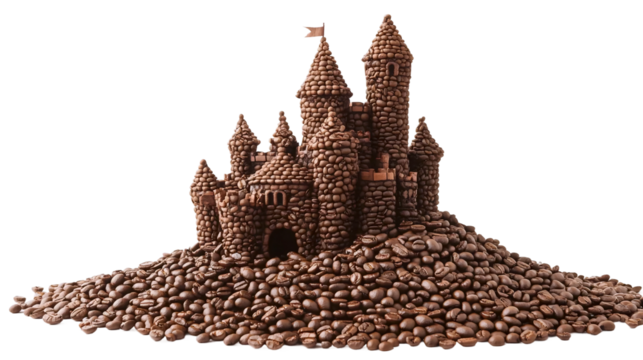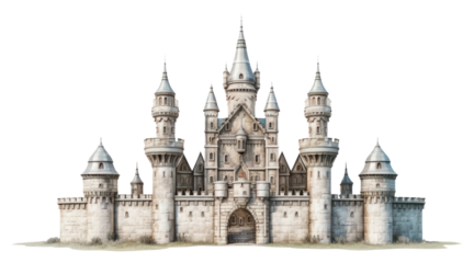 Detailed sandcastle with towers, isolated on transparent cutout background